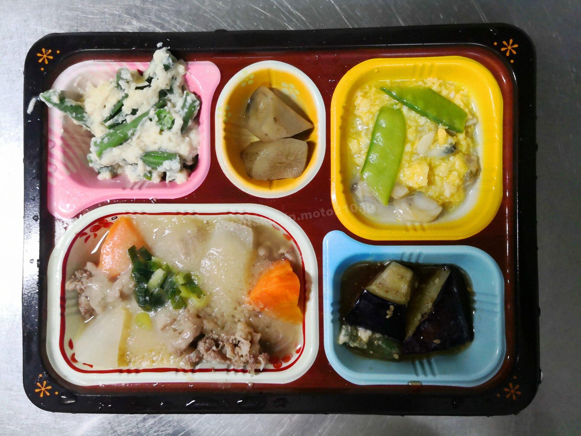 - 感想: 牛肉の味噌煮は、柔らかい大根と人参にだしがよく染みていておいしい。牛肉の量は控えめ。卵とじのあさりは意外と粒が沢山入っていて食べごたえがあった。副菜の白和えと茄子もうまい。ごぼうは若干の硬さがあったので、歯が弱い人は無理しないほうが良いかも。